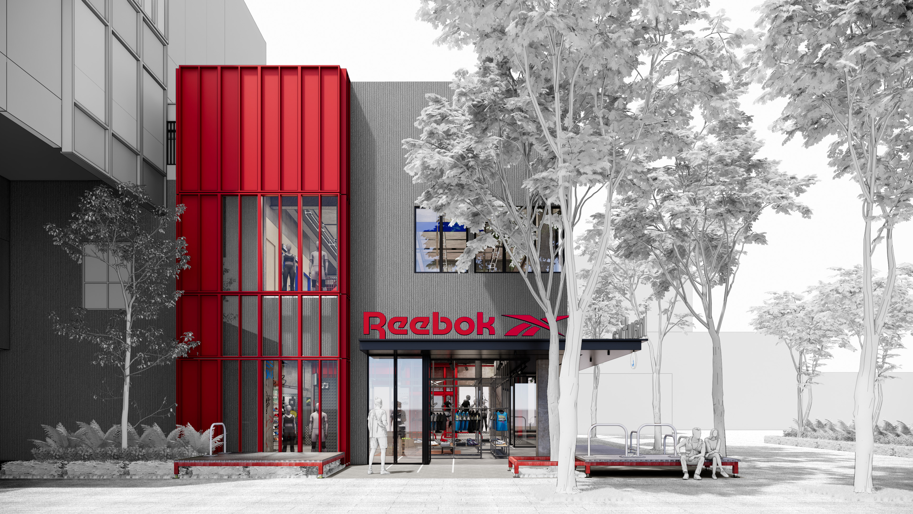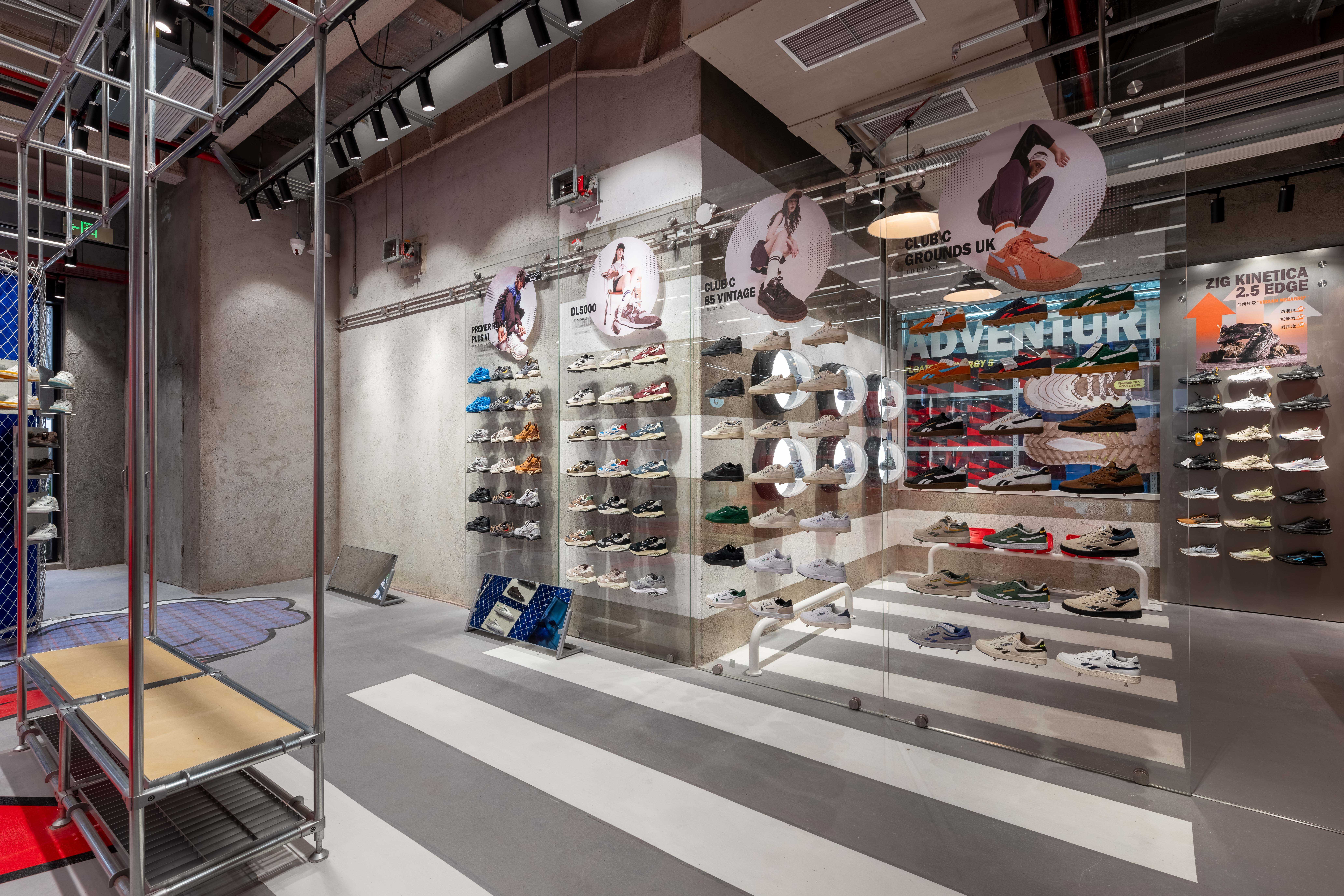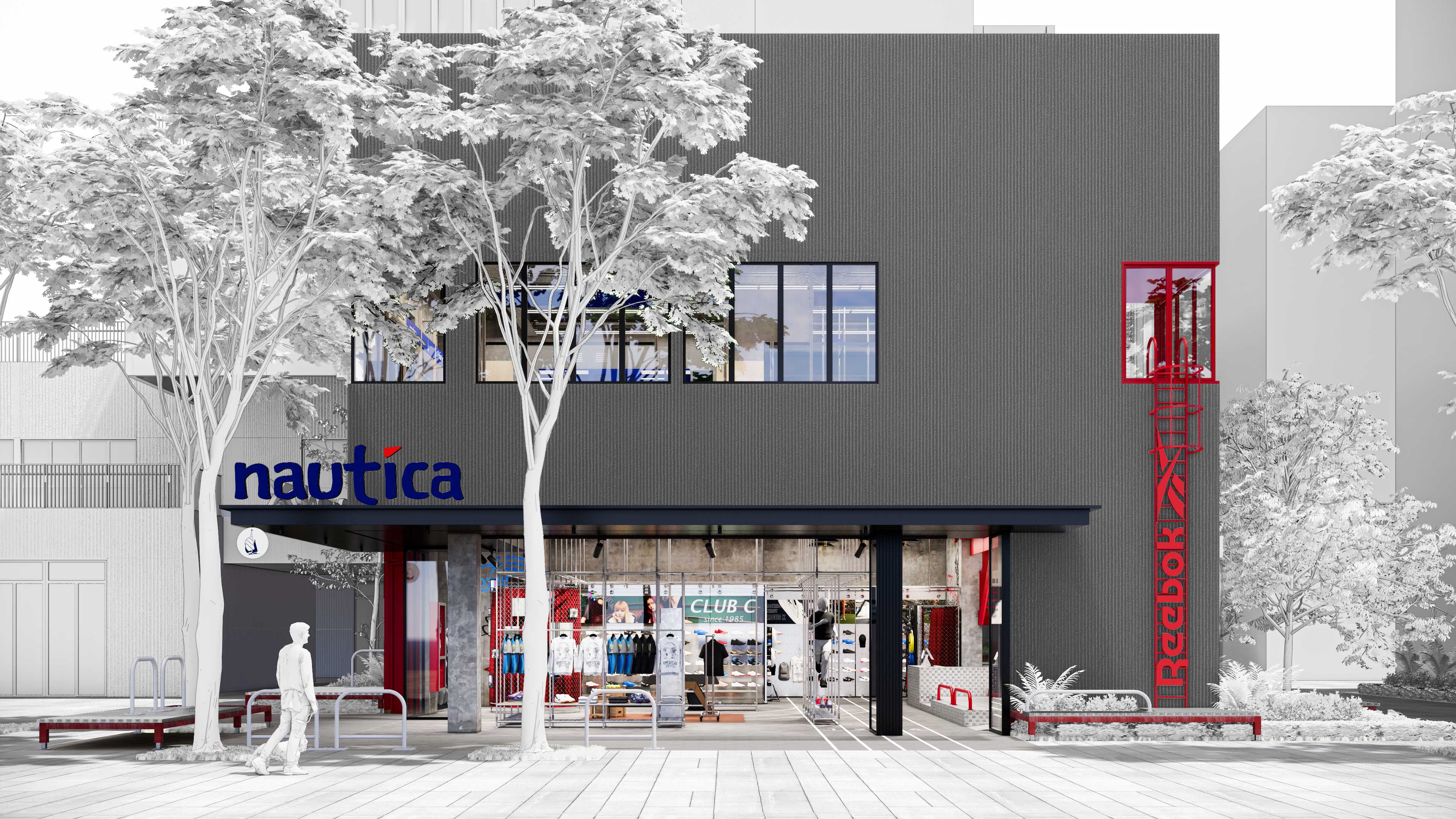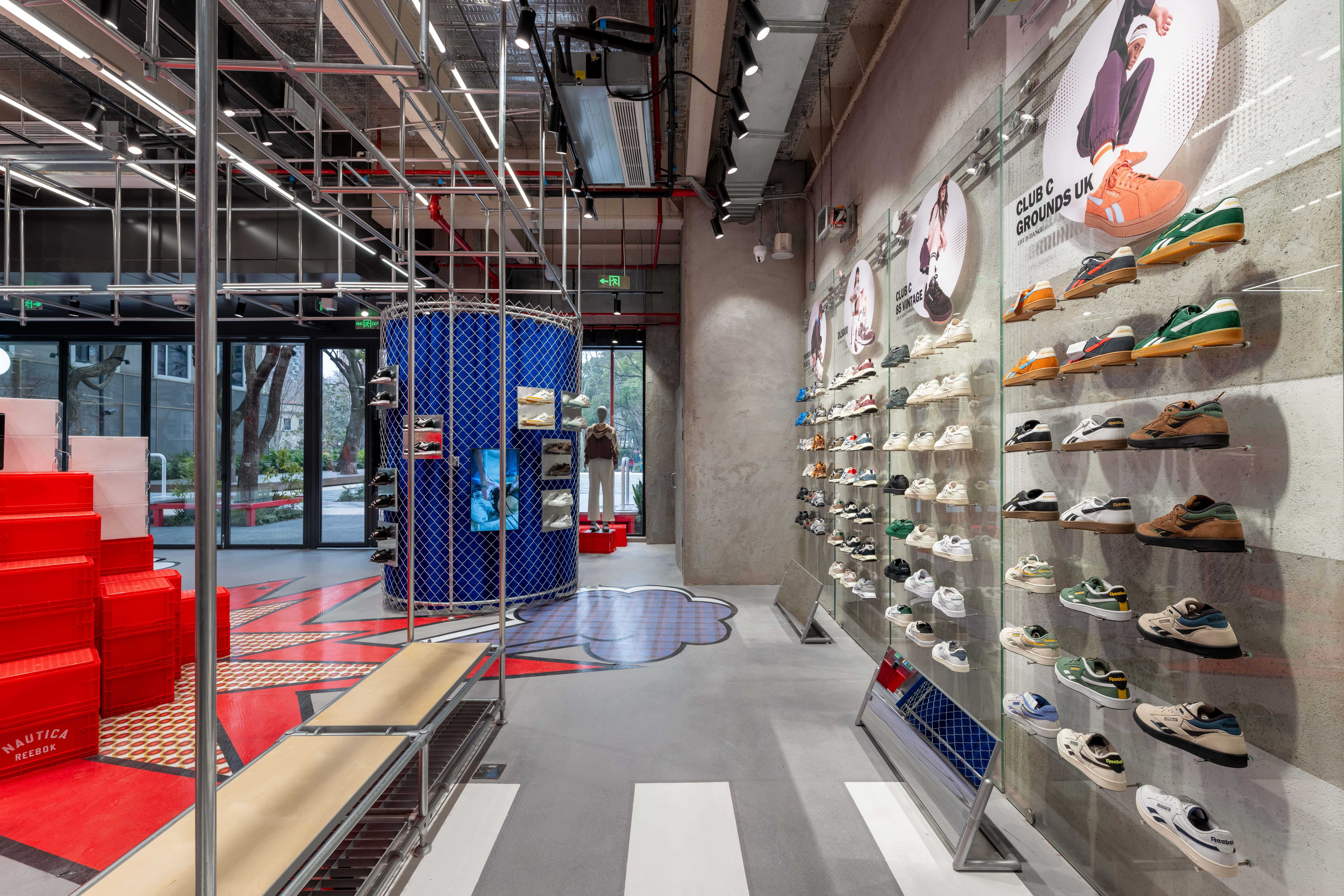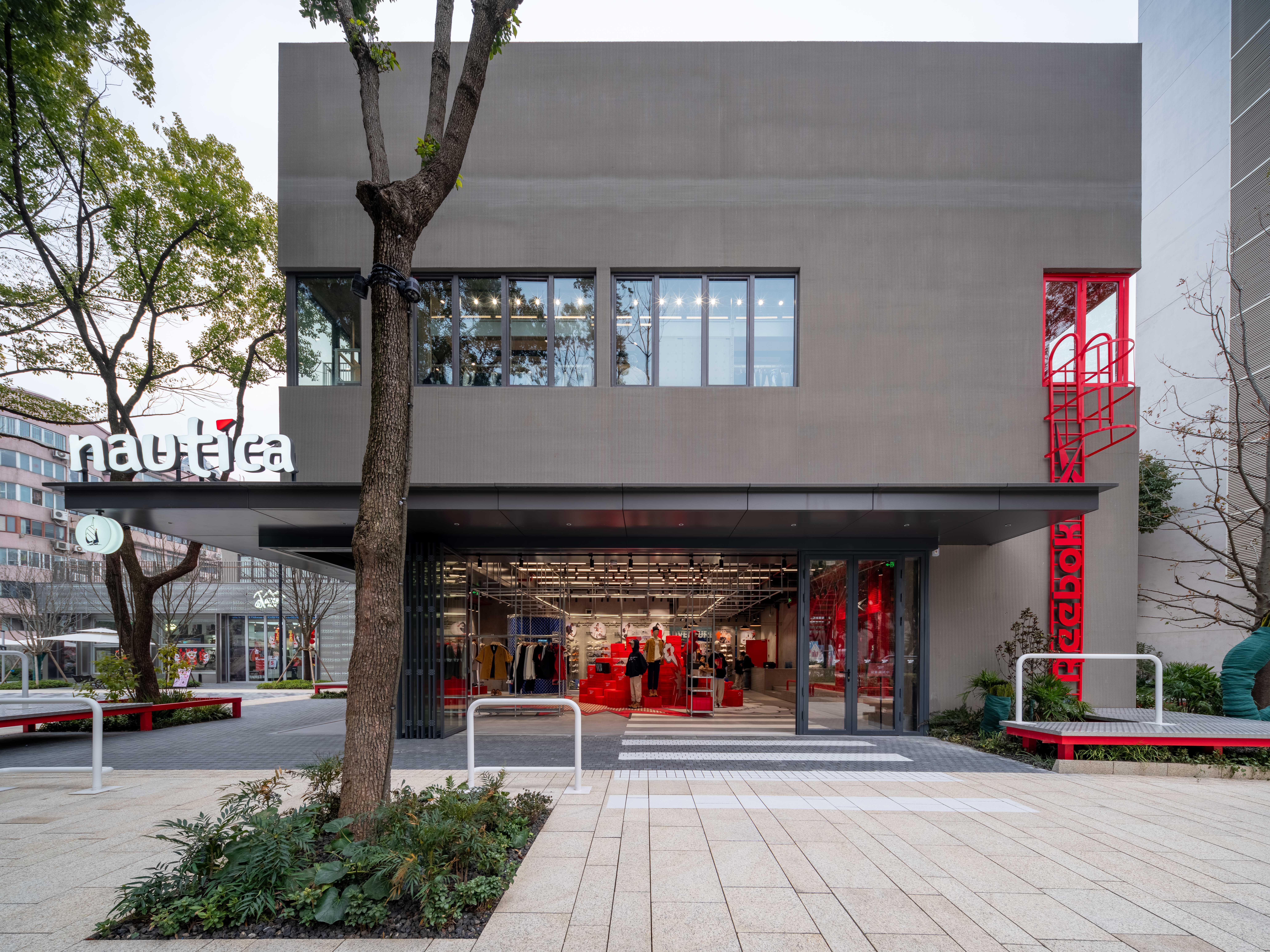 这是一个包括Reebok&nautica(white sail)的双品牌联合呈现的全新空间,两个品牌的共同基因“街头文化”串联起了这场SHOW,用一种开放式的街道场景坐落于上生新所二期的17号楼。 空间包括一层(外广场)二层与屋顶三部分。 延续着新所二期的建筑逻辑,我们并未选择颠覆性的设计方式,而是让一切都顺其自然的发生: 因为一层的大屋檐,我们顺应采用了可以全敞开的进入方式,并用街道人行斑马线引入, 因为建筑红色的外立面体块,我们结合了项目的竖向交通,并延续至外场平台,提供途径的人们更多休息停留的空间。 因为二层转角的小窗,我们做了带有品牌logo的爬梯场景, 因为三层的屋顶空间,我们藏了一处空间彩蛋后续会与大家见面。 一个生长式的零售空间,希望打破室内外的边界,也希望丰富园区与“街道”的关系,从而让更多的场景与故事可以再这里发生。